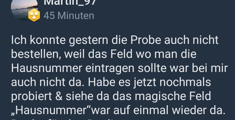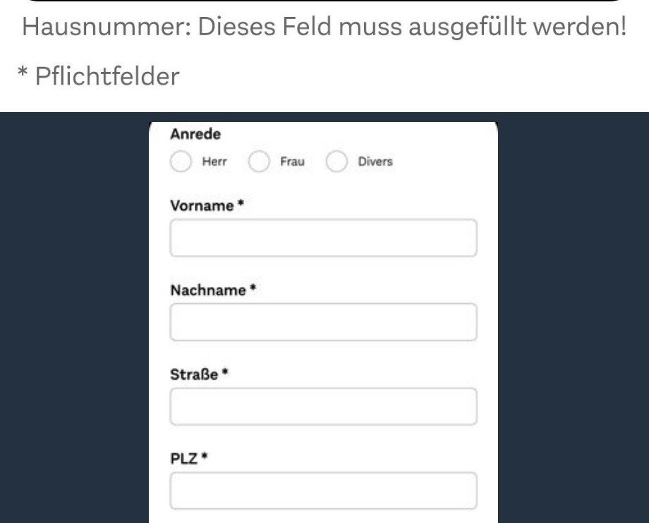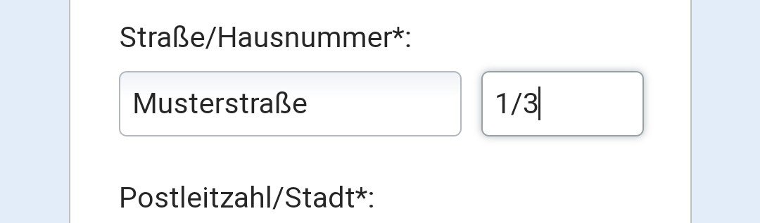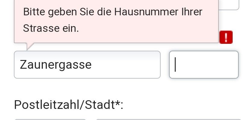 Seit 2 Tagen bekomme ich beim Ausfüllen von Formularen* auf unterschiedlichen Webseiten jeweils (sinngemäß) eine Fehlermeldung, ich möge bei meiner Adresse neben der Straße auch die Hausnummer eintragen.