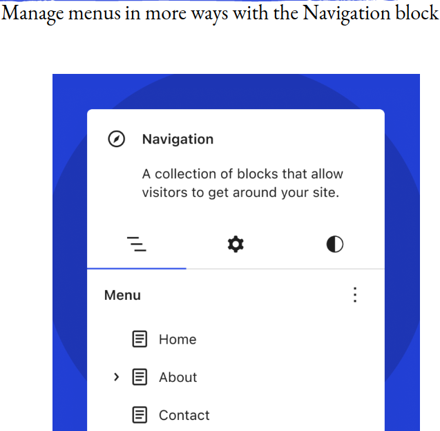 Die Menüverwaltung wurde erweitert und hat sich auf vielfältigere Weise mit dem Navigationsblock verbunden.