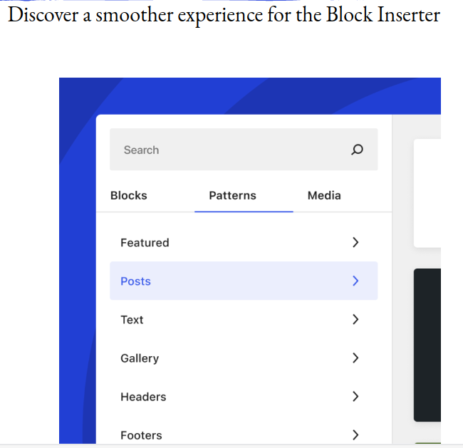 Menüelemente schneller hinzufügen, entfernen und neu anordnen – mit einer neuen Sidebar-Erfahrung, die die Bearbeitung der Navigation Eurer Website vereinfacht. So gibt es ein sehr viel reibungsloseres Erlebnis für den Umgang mit dem Block Inserter.