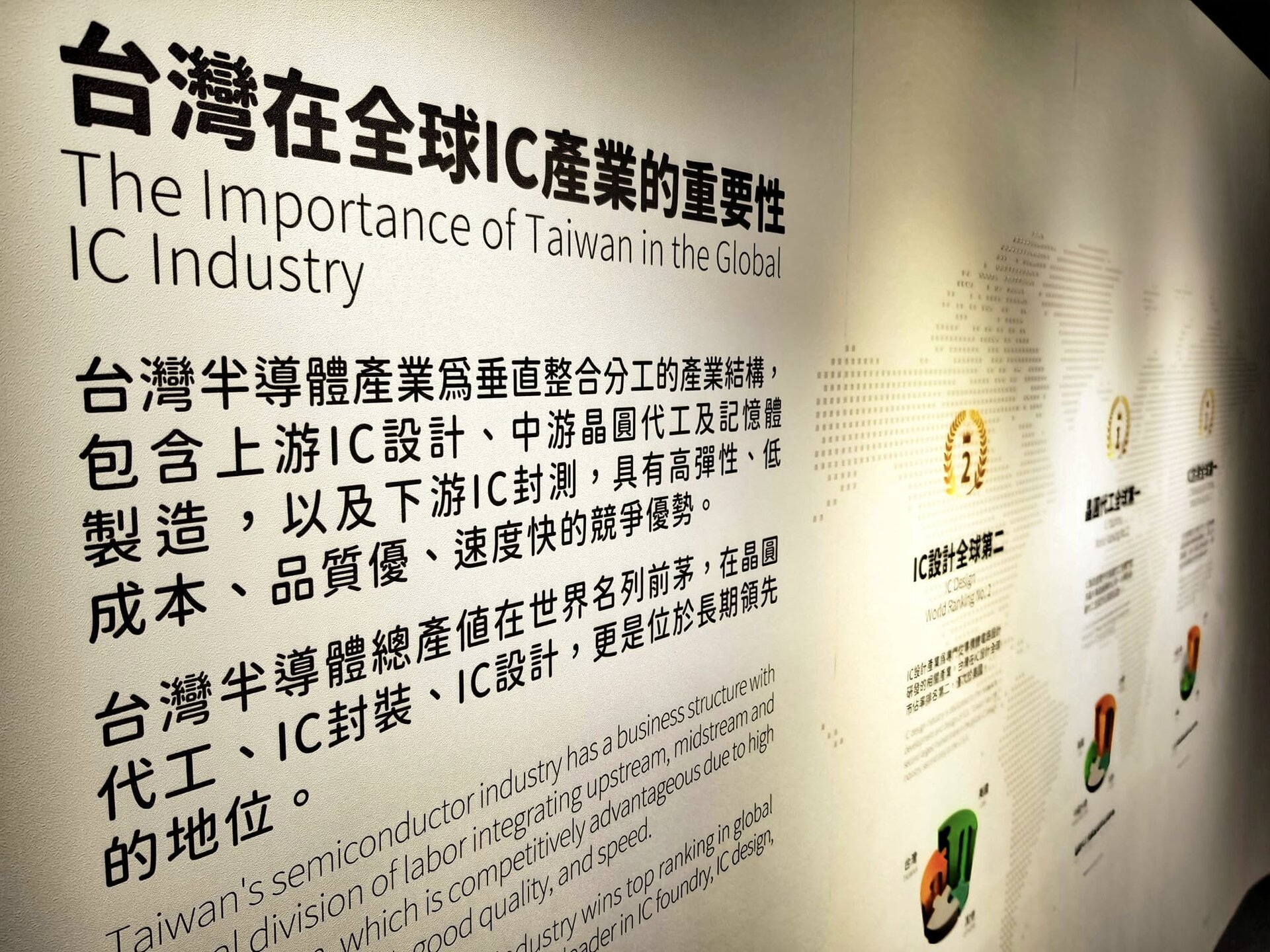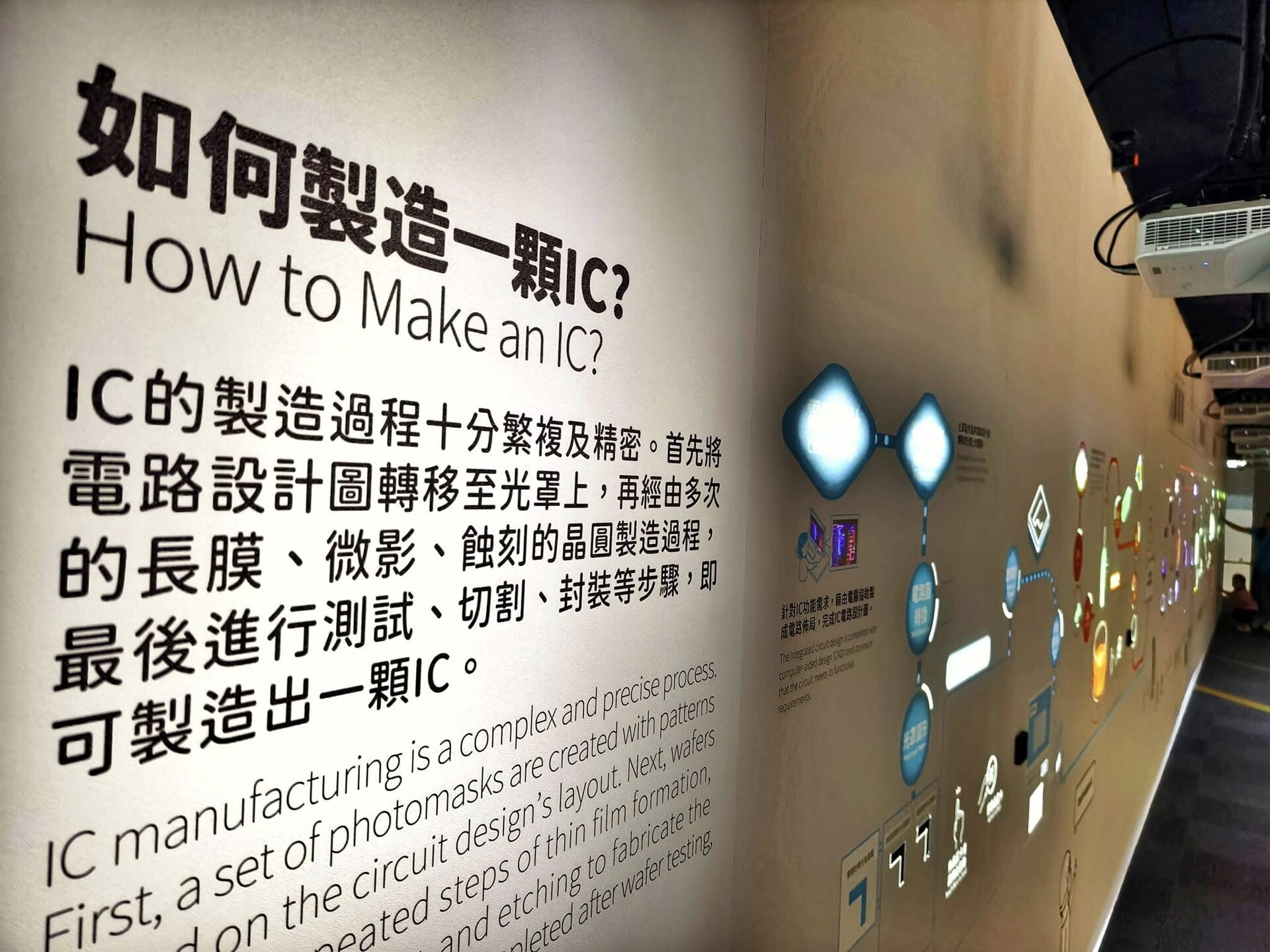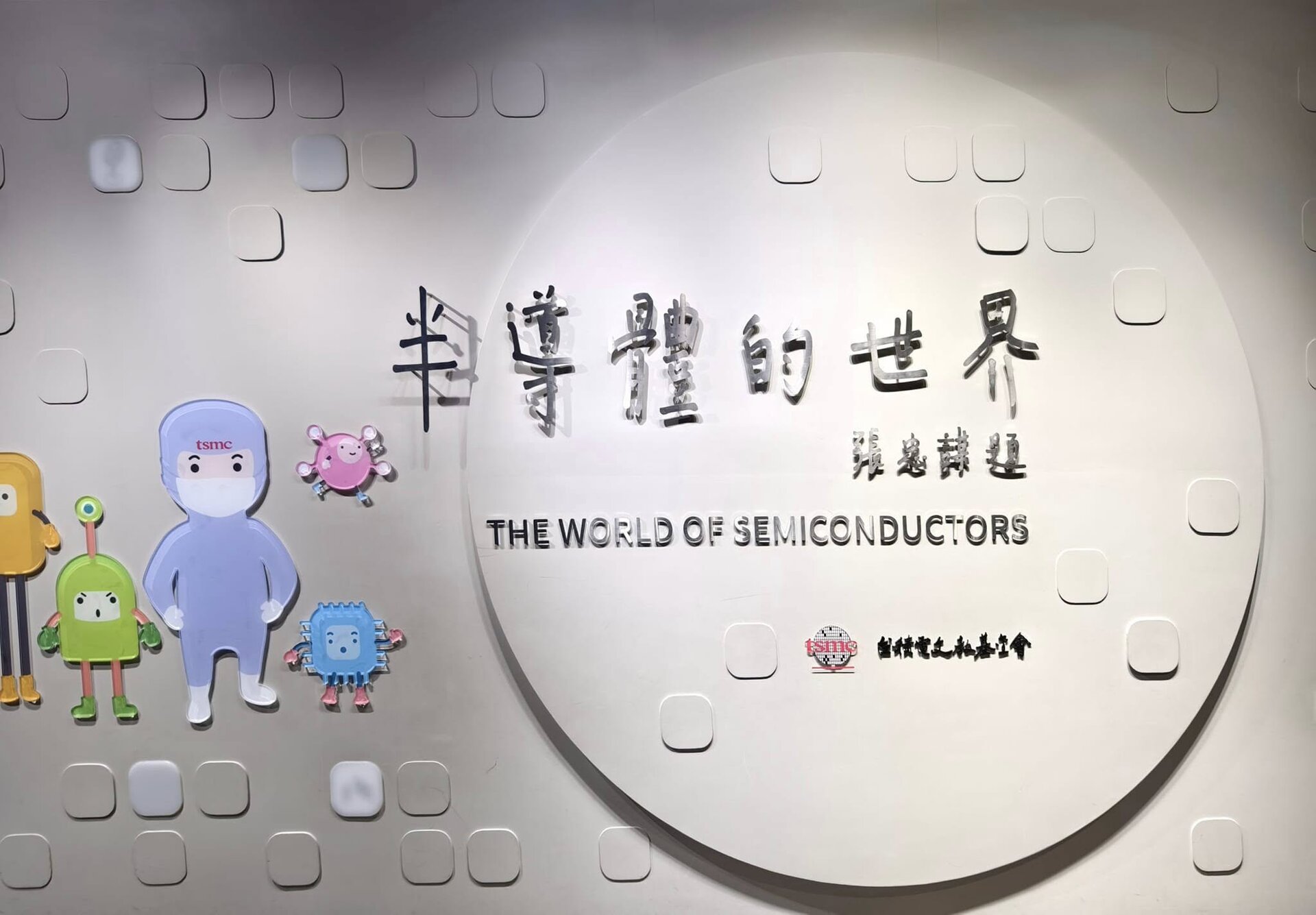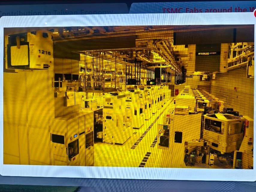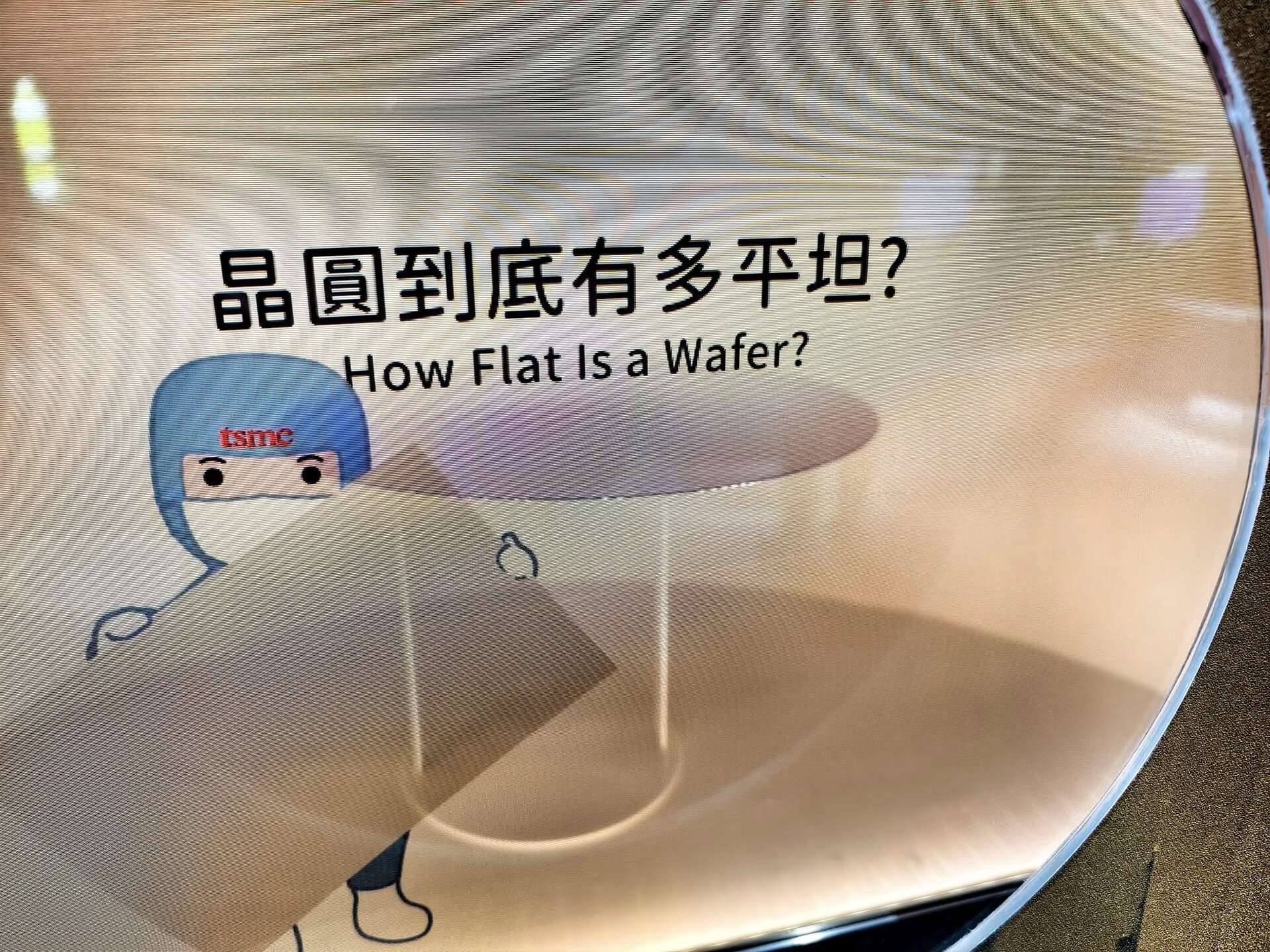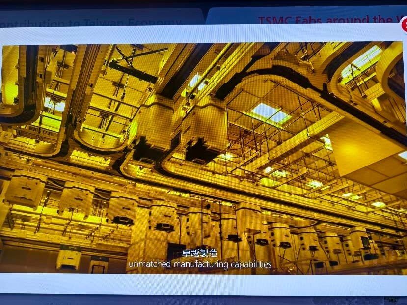 Taiwan ist das Herz der globalen Halbleiterindustrie. 80% aller Halbleiter werden in Taiwan hergestellt. 60% allein bei TSMC. Neben TSMC, die in der öffentlichen Berichterstattung sehr präsent sind, gibt es noch weit mehr große Hersteller, Fabs, Tester und Assembler in Taiwan und in anderen Ländern. Während es verständlicherweise streng verboten ist, in den sicheren Produktionsbereichen dieser Firmen Fotos zu machen, besteht allerdings die Möglichkeit für Fotos im TSMC Museum of Innovation in Hsinchu in Taiwan. Die Fotos, die man dort von den verschiedenen Lehrvideos machen darf, geben einen realistischen Einblick in den komplexesten industriellen Produktionsprozess der Welt. Der Eindruck in die Fortschrittlichkeit dieser Technologie und die damit verbundenen Anforderungen an die Sicherheit sind nicht nur auf TSMC beschränkt, sondern betreffen sämtliche Waferfabs, Tester und Assembler aller Hersteller in Taiwan und anderswo. Dieses ist eine Projektionsfläche im TSMC Museum of Innovation, von der die meisten der folgenden Fotos stammen: