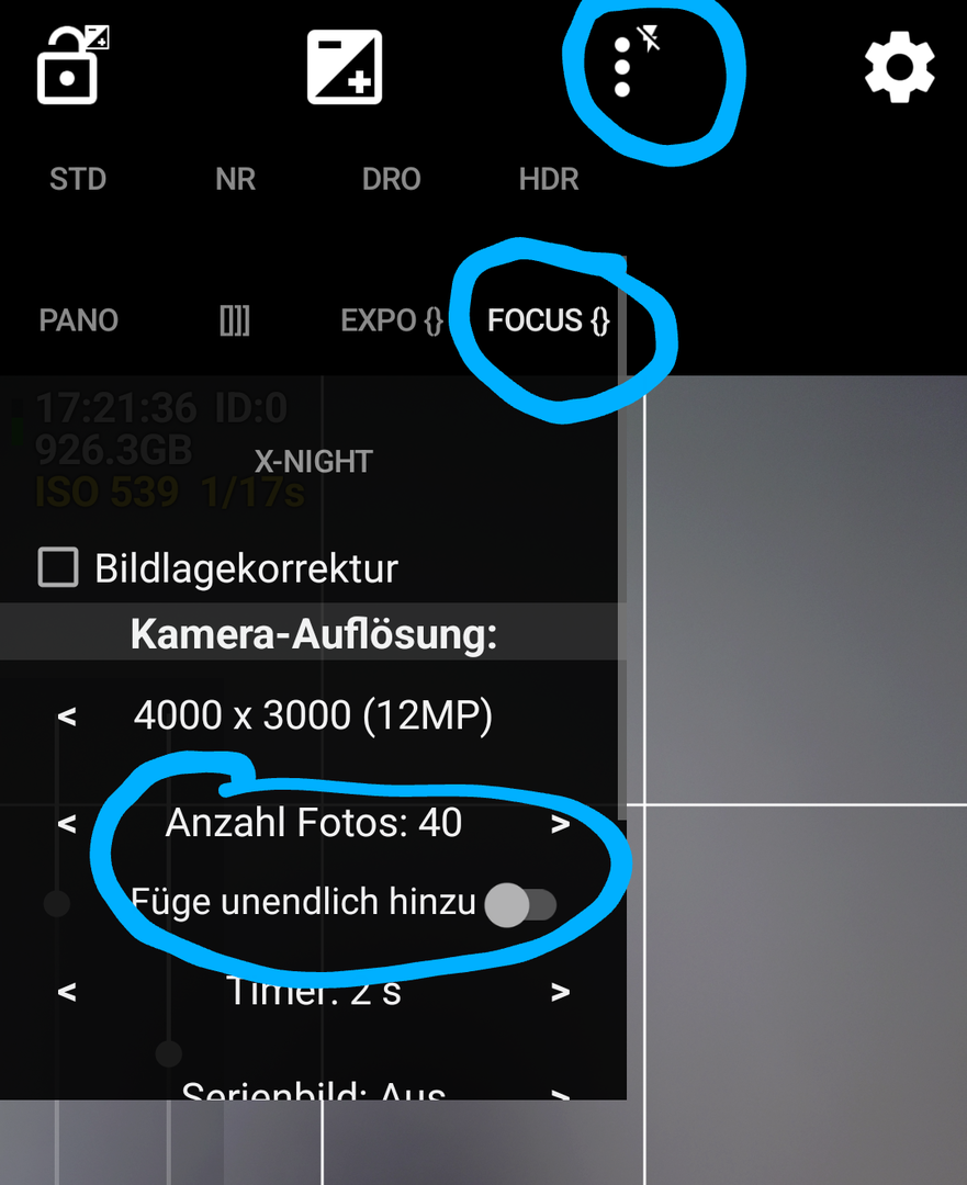 Mit der App Open Camera in der neusten Version ist jetzt auch Fokusstacking für zB Makroaufnahmen möglich. Man muss dabei in der App auf Camera2-Api wechseln. In den Einstellungen (3 Punkte) kann man dann den Verlaufsweg mit Schiebern definieren und die Anzahl Aufnahmen.