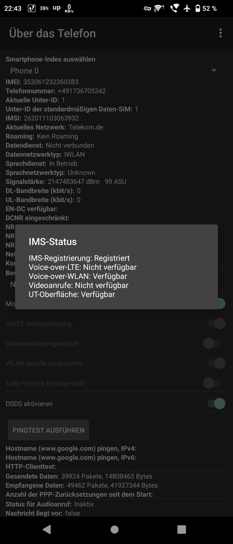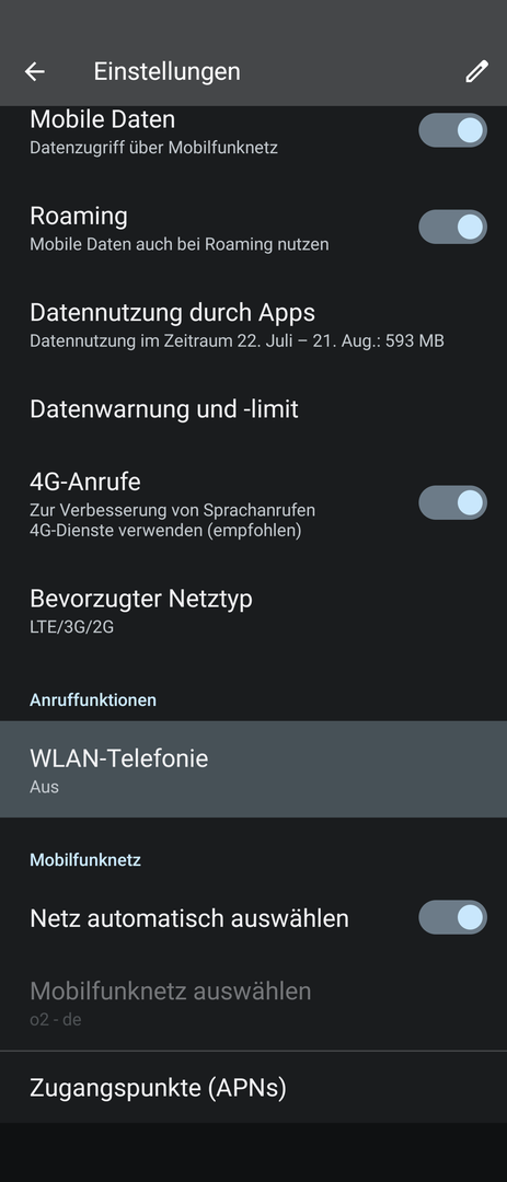 In den Einstellungen ist VoLTE und WLAN Telefonie aktiv und die Roaming Präferenz auf WLAN eingestellt.