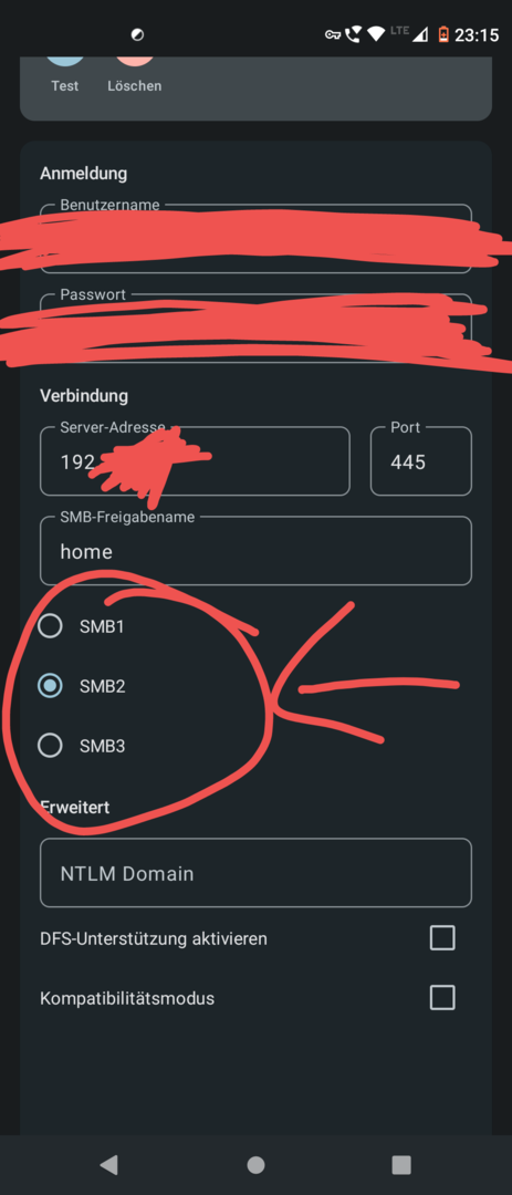 Wenn ich nun in Foldersnych ein Konto anlege mit SMB2, dann bekomme ich beim Verbindungstest immer die Meldung "Der Freigabename muss für das SMB2-Konto eingegeben werden" Egal ob ich SMB 2 oder 3 auswähle.