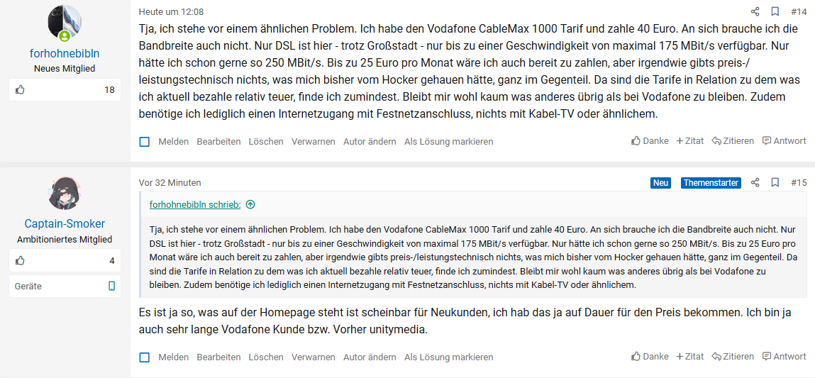 Hallo, ich hab bei Vodafone nen Cable Max Tarif für 45 Euro aber eigentlich brauche ich die Gigabit Leitung gar nicht mehr und jetzt hab ich gesehen das es ja gar nicht mehr günstiger geht zumindest nach einem Jahr Laufzeit sind die Verträge ja mindestens genauso teuer für ne 250 Leitung. Die Preise sind ja explodiert, hat jemand ne Idee wie ich sparen kann ohne jedes Jahr zu kündigen?