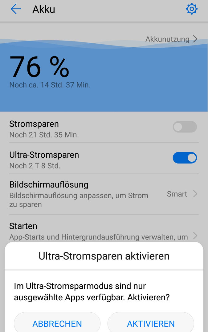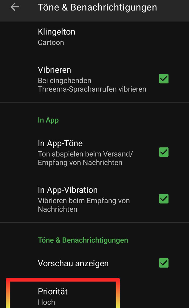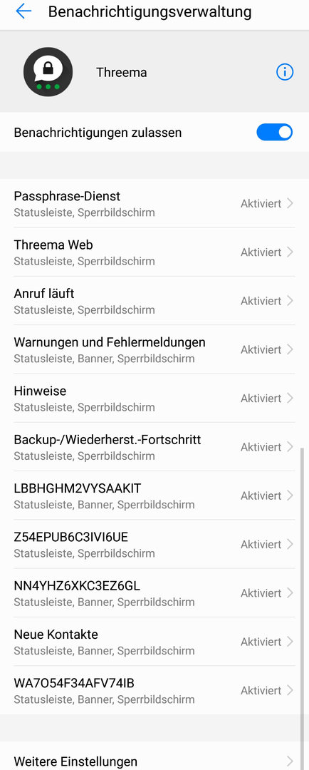 In den Telefon-Einstellungen unter Akku - App-Start ist Threema auf "manuell" eingestellt. Es wurden alle dort angegebenen Möglichkeiten (z. B. "Im Hintergrund ausführen") ausgewählt.