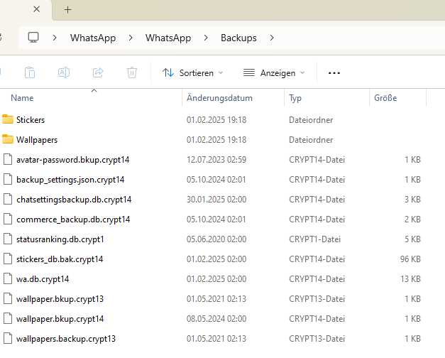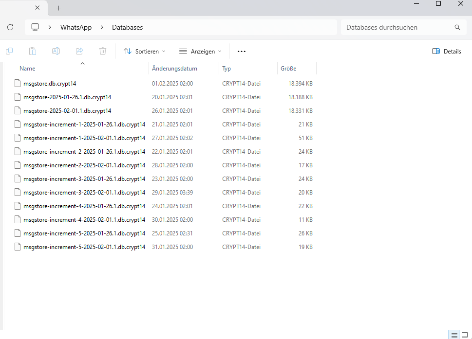 Ich habe zudem die Datei msgstore-2025-01-26.1.db.crypt14 auf das Xiaomi-Gerät kopiert, das Datum entfernt (sodass die Datei den Namen msgstore.db.crypt14 trägt) und sie in den neuen WhatsApp-Ordner eingefügt – jedoch ohne Erfolg. Anschließend habe ich die Datei in das Verzeichnis Internal Storage\Android\media\WhatsApp\Databases verschoben und WhatsApp auf dem Xiaomi erneut installiert, doch die Chatverläufe blieben weiterhin unauffindbar.