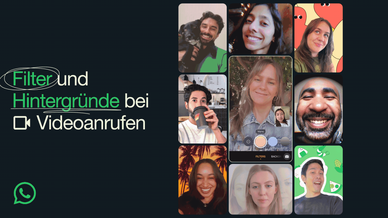 WhatsApp bietet nun die Möglichkeit, Videoanrufe mit Filtern und Hintergründen zu versehen. Zu den Filtern zählen: Warm, Kühl, Schwarzweiß, Lichtleck, Verträumt, Prismenlicht, Fischauge, Vintage-TV, Milchglas und Duoton. Bei den Hintergründen stehen dir unter anderem Weichzeichnen, Wohnzimmer, Büro, Café, Kieselsteine, Foodie, Smoosh, Strand, Sonnenuntergang, Feier und Wald zur Verfügung. Die neuen Funktionen stehen in den nächsten Wochen für alle zur Verfügung.