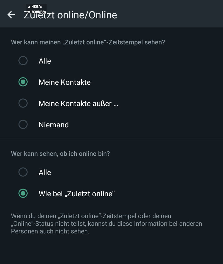 - oben beim Kontakt sichtbar beispielsweise "zuletzt online heute um 10:00"