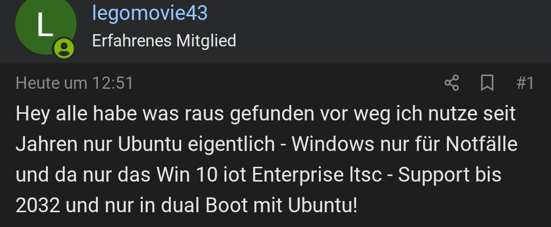 Hey alle habe was raus gefunden vor weg ich nutze seit Jahren nur Ubuntu eigentlich - Windows nur für Notfälle und da nur das Win 10 iot Enterprise ltsc - Support bis 2032 und nur in dual Boot mit Ubuntu!