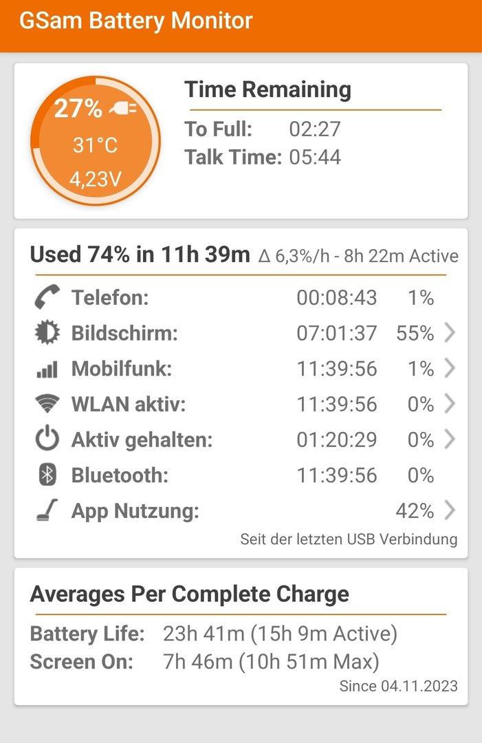 Möchte auch mal von meinen Erfahrungen berichten - da ich denke, dass MIUI dann doch noch etwas spezieller je nach Nutzungsverhalten durchhält als andere Roms... Ich nutze das Gerät beruflich sowie privat, also dauerhaft im Dual SIM Modus. Bin damit häufiger mal unterwegs, knipse paar Bilder, telefoniere ca. 2-3h täglich und mache etwas Messaging und Social Media. SoT liegt somit bei einem Tag von 8 (Start mit voller Ladung) bis ca. 23 Uhr bei 4,5-5h im Schnitt. Danach gibt's noch das typische abendliche browsen und bisschen mobile Gaming und dann gehe ich immer mit 30%+ ins Bett.