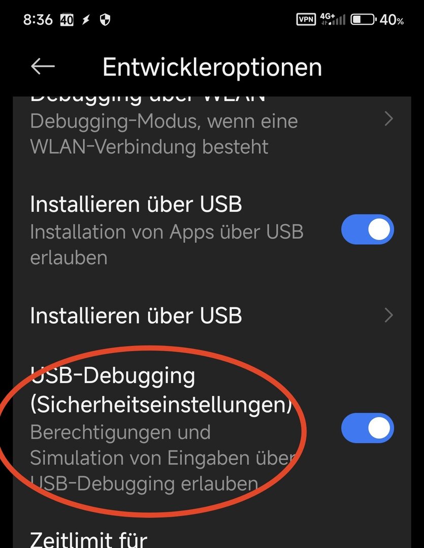 Eine Einstellung bei Entwickler-Optionen - ADB Debugging im Laden Modus aktivieren (wie beschrieben) habe ich nicht.