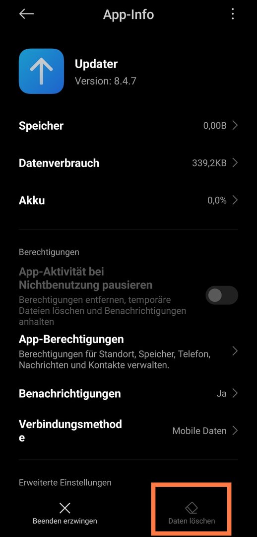 lösche mal die Daten der Updater App.
