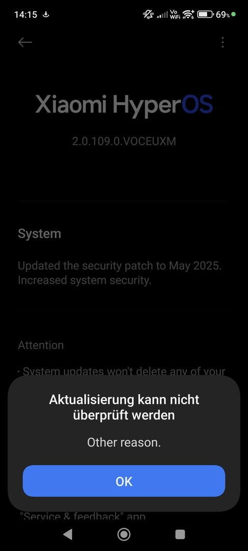 Genau das gleiche Problem habe ich auch. Kann auch eine andere Region einstellen. Kommt die gleiche FehlermeldungMarcM0299 schrieb:@lazy74 komisch nur das ich schon die Komplette Update Datei habe vom Hyper OS 2.0.201.0 VOCEUXM, lässt sich jedoch manuell nicht installieren (bricht immer mit other Reason ab)
