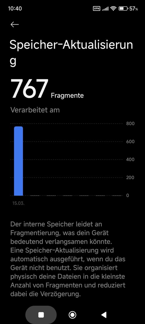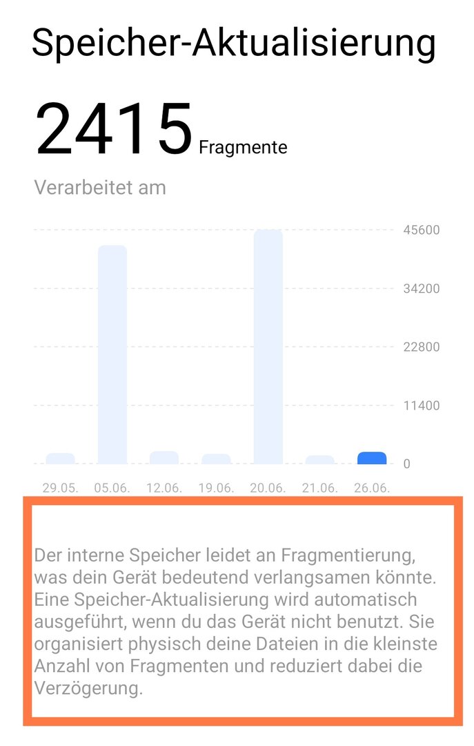 Unter Speicherplatz, Speicheroptimierung gibt es den Unterpunkt Speicheraktualisierung, dort wird eine Fragmentierung angezeigt, die das Gerät von selbst behebt. Flashspeicher sollte man eigentlich nicht defragmetieren, nicht notwendig und schlecht für den Speicher. Hat jemand eine Ahnung was das soll?