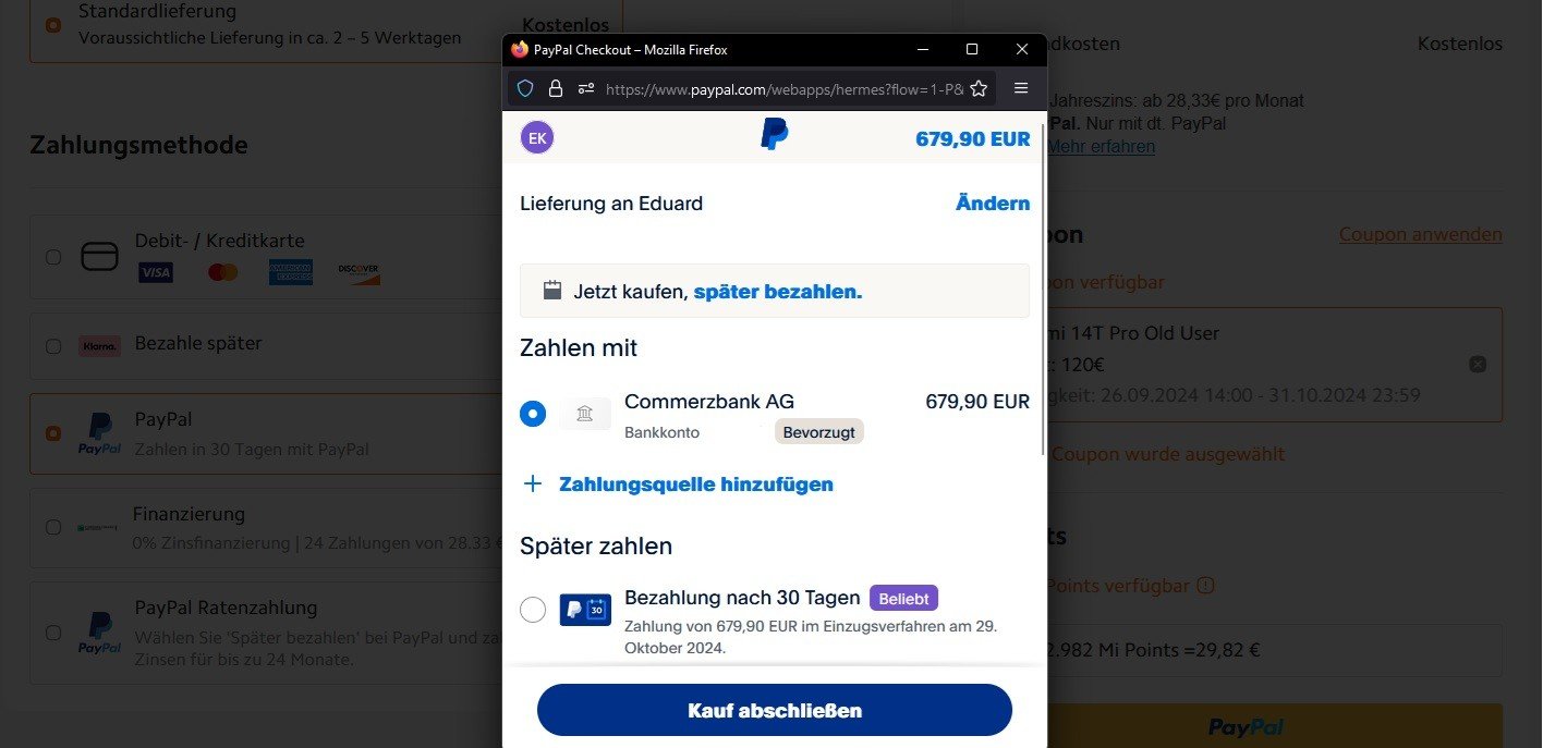 Mach ich da was falsch, oder kann man da wirklich nur noch auf "Kredit" kaufen wenn man per paypal zahlen möchte. Kann nur wählen "Nach 30 Tagen zahlen" oder "Kredit/Ratenzahlung" aber das ganz normale bezahlen geht nicht/nicht zur Auswahl.