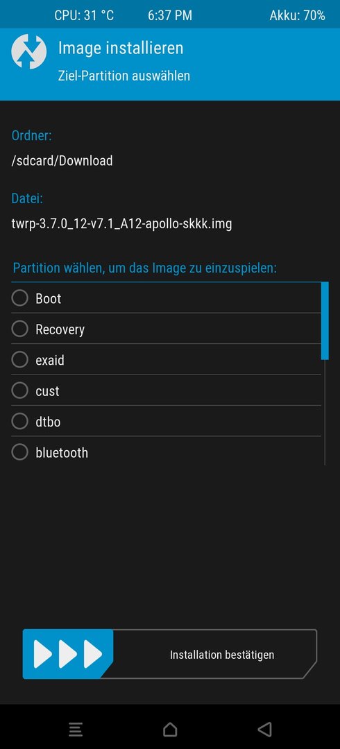 Recoverylinuxnutzer schrieb:Ich werde aus deinem Screenshot nicht schlau. Nehmen wir also an, ich kann das twrp.img vom USB-Stick auswählen, was wähle ich dann als Ziel bei deinem Screenshot aus?