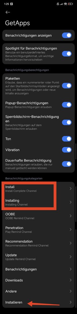 Ich habe (ist auf dem zweiten Bild durch Markierungen erkennbar) alle Benachrichtigungen, wo es um Installationen geht deaktiviert. Leider habe ich danach immer noch diese Art von Benachrichtigungen bekommen. Das deaktivieren hat also nichts gebracht.