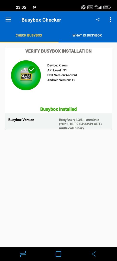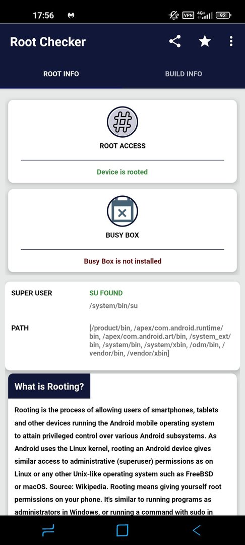 Wenn ich das Handy neustarte und Root Checker starte ist keine BusyBox installiert.