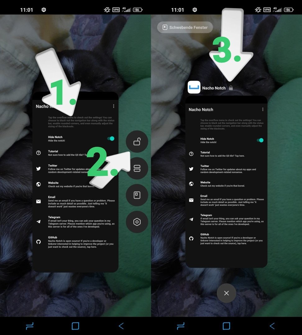 Zu 3: Recent Taste tippen dann werden die zuletzt geöffneten Apps gelistet. Die Nacho Notch App antippen und warten bis rechts oder links Symbole erscheinen. Dort das Vorhängeschloß antippen. Sollte erste Symbol sein. Kann man jedezeit genau so wiederholen um es wieder zu entsperren.
