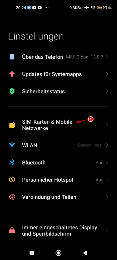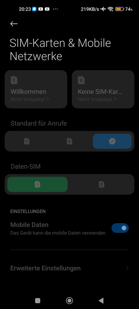 Aber wenn ich im Handy (Screenshot1: Einstellungen-Menü) unter Sim-Karteneinstellungen (Screenshot2) schaue, ist alles unbedienbar (kein Schieberegler beweglich, kein Button drückbar - quasi wie "ausgegraut, oder disabled").