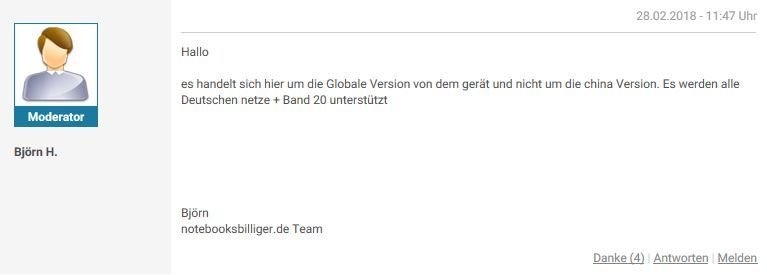 Im unterstellen scheinst Du ja schnell zu sein.... Vielleicht ist es einfach nur Unkenntnis? Bei "Fragen und Antworten":frankco schrieb:Vorsicht bei den angebotenen Redmi 4x auf notebooksbilliger.de wenn in der Beschreibung nur ein Haken bei den LTE Frequenzen steht sind die Geräte ohne Band 20, ich unterstelle hier dem Verkäufer eine gewisse Arglist, denn bei anderen Modellen wird das eindeutig angegeben.