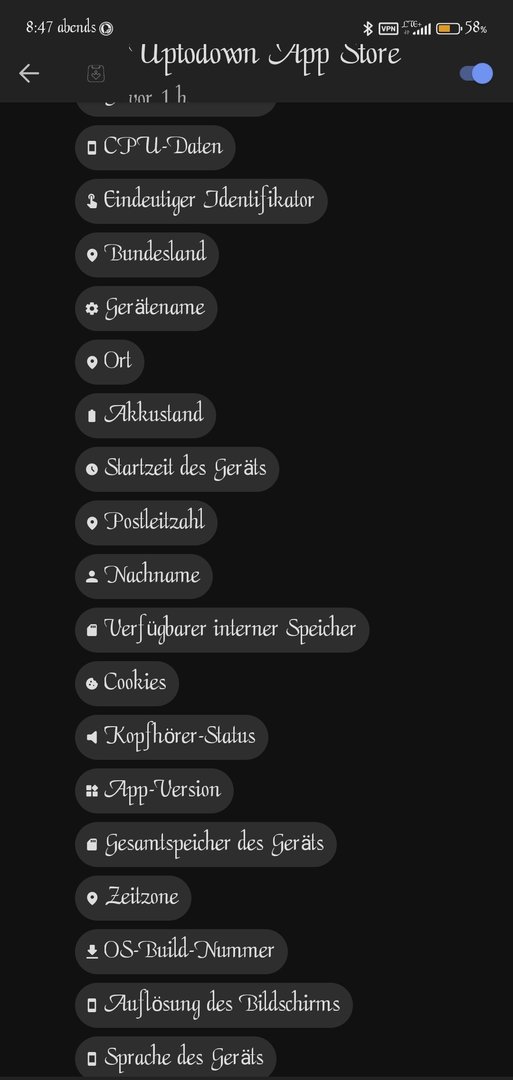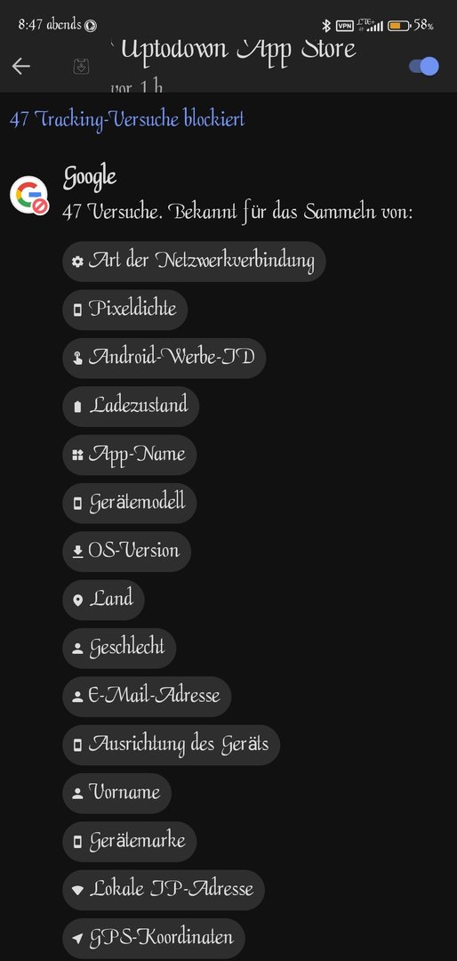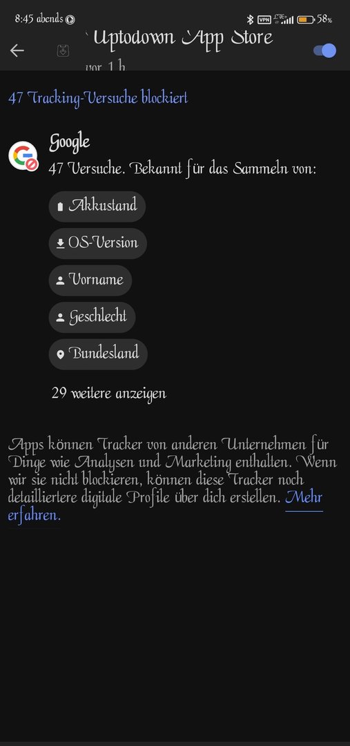 Beispiel bezieht sich auf die Protokollierung der Applikation Uptodown APK Store. Google trackt bis zu 81 Prozent Daten für ihre Marketing Zwecke ohne sich nur einen Gegenstand online gekauft zu haben was sich auf die Nutzung von Android bezieht. Logisch.