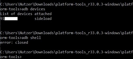 Gebe ich jetzt in der Konsole "adb devices" ein, wird mir ein Device angezeigt, "adb shell" beendet aber mit Error.