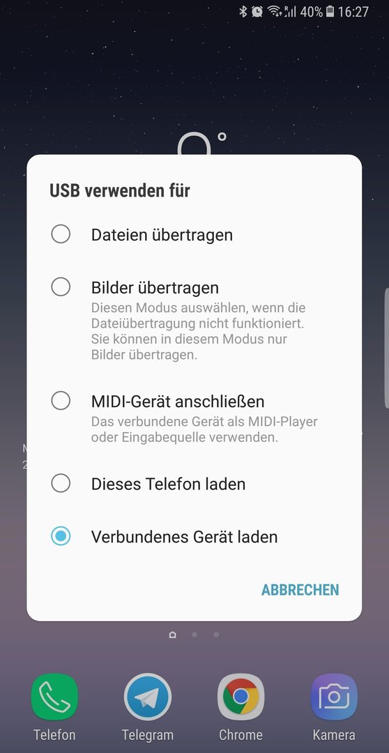 Sobald ich den USB-C Stecker in das Gerät stecke, kommt als USB Option: Verbundenes Gerät laden.